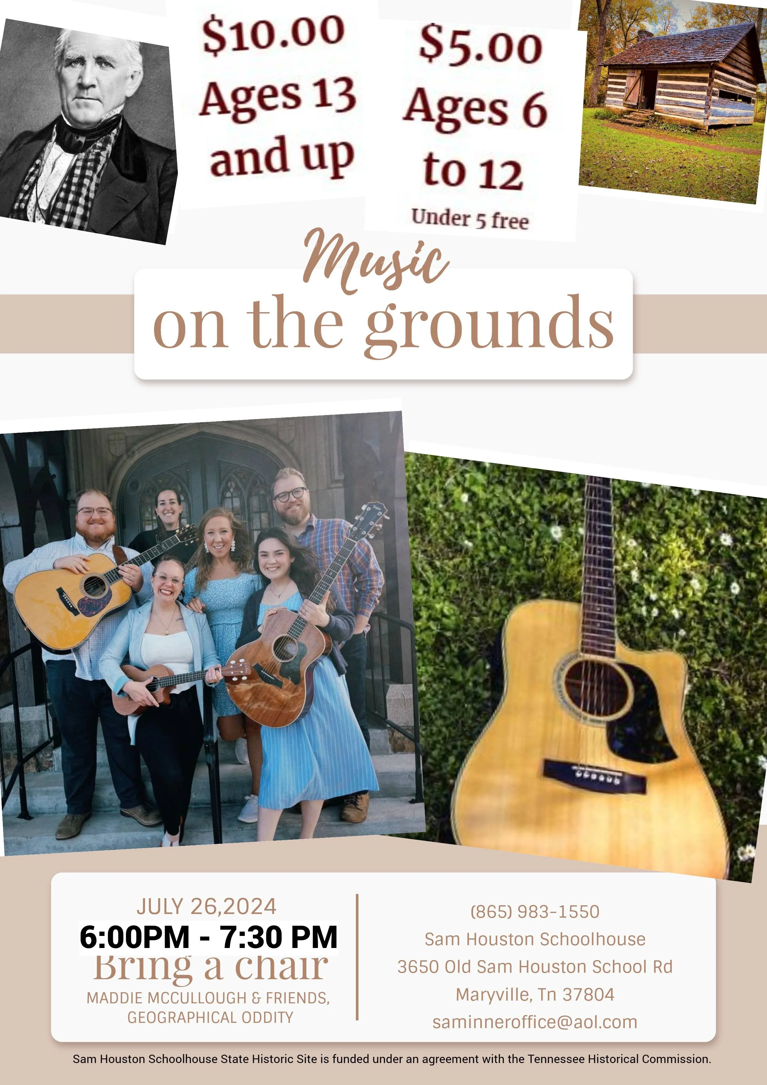 Music on the grounds Friday, July 26, 2024 6:00 PM 7:30 PM Sam Houston Historic Schoolhouse 3650 Old Sam Houston School Road Maryville, TN, 37804 United States (map) Google Calendar ICS